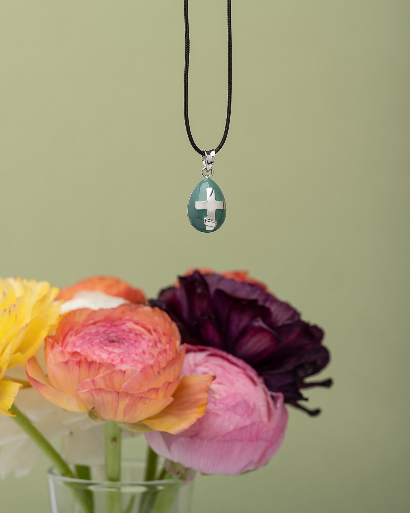 Ένα μικρό κόσμημα με μεγάλη γιορτινή αύρα. Το μίνι μενταγιόν σε σχήμα αυγού είναι κατασκευασμένο από ασήμι 925 και αγκαλιάζεται από ματ σμάλτο που χαρίζει απαλή, βελούδινη υφή και σύγχρονη αισθητική.